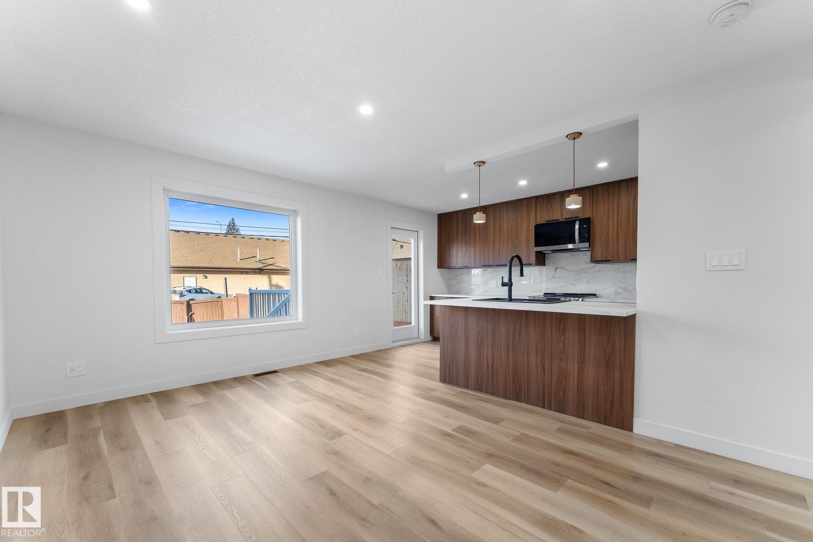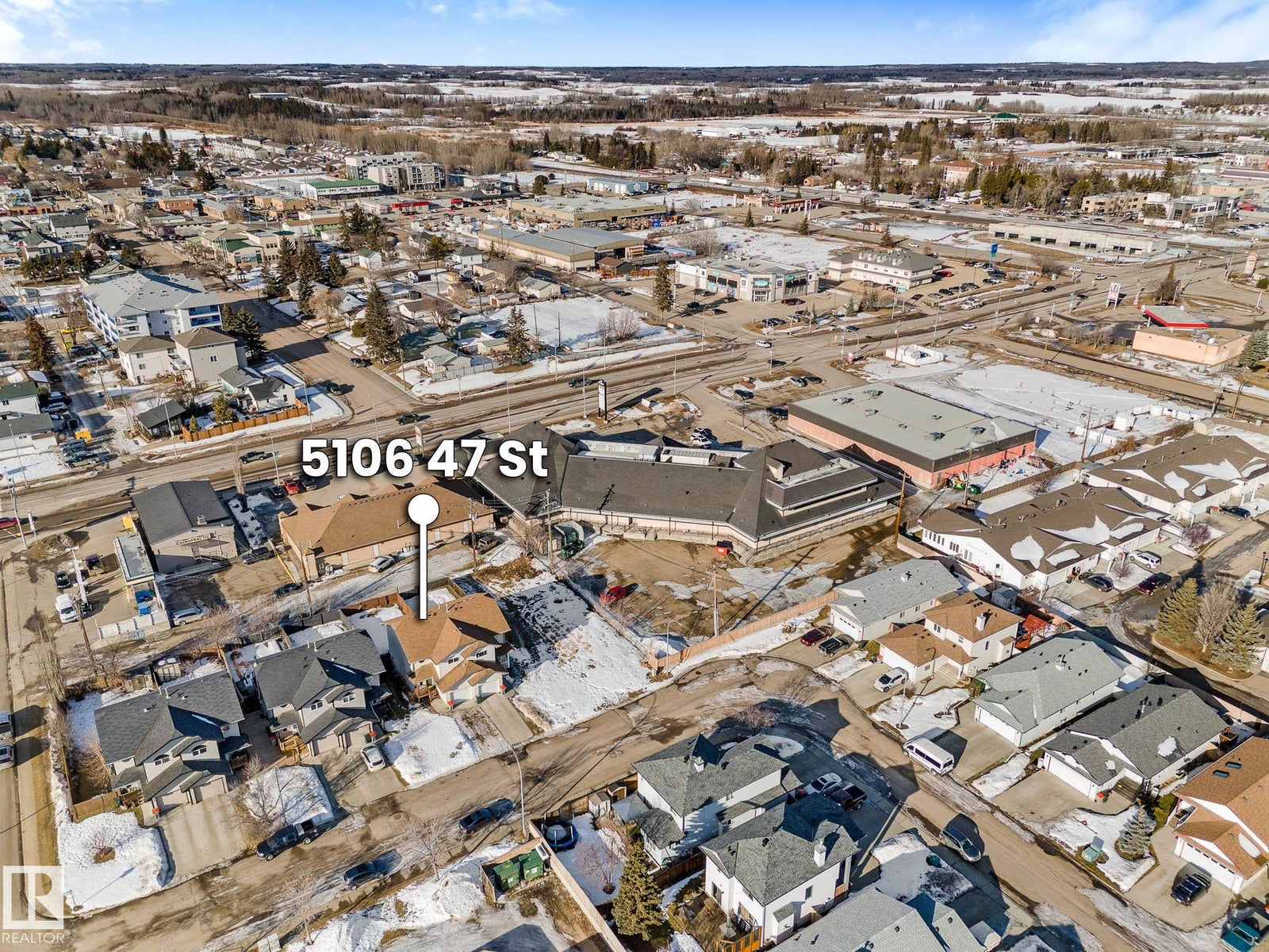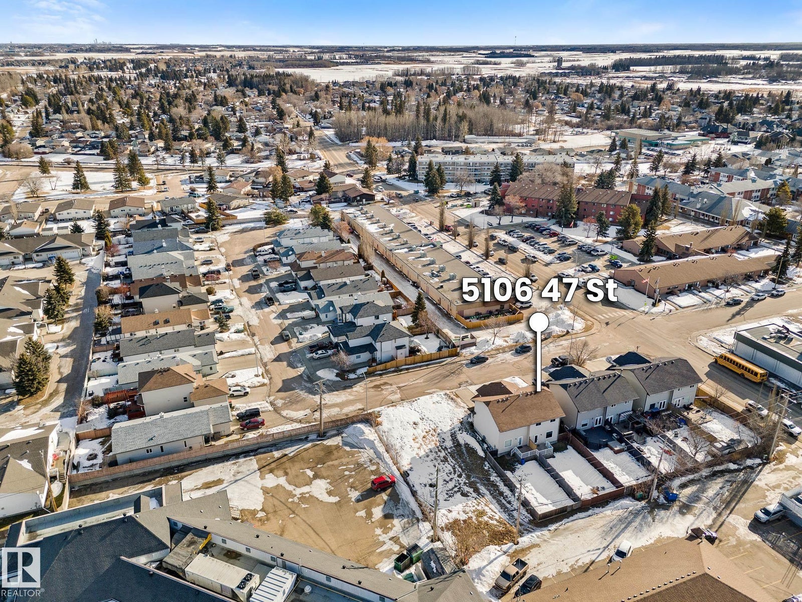 Welcome to 5106-47 Street, ideal for first-time buyers or young families, this bright, move-in-ready 1169 sq ft 2-storey half-duplex offers 3 bedrooms, 2 full baths, and a single attached garage. The main floor features a welcoming entry and an open-concept living area. The brand new kitchen includes warm cabinetry with built-ins, stainless appliances, light counters, and matching tile backsplash. Fresh paint, moss green trim and warm vinyl plank flooring runs throughout, and a fully updated bath with a tiled shower completes the level. Upstairs has 3 spacious bedrooms, including a bright primary, plus an updated 4-piece bath. The unfinished basement offers potential for a 4th bedroom or another living space with laundry. The large west facing backyard is great for gardening. Recent updates include trim, flooring, doors, kitchen cabinets, counters, backsplash, lighting, bathroom vanities and HWT. The back deck is wood with a concrete coating. Close to schools, shopping, and more.