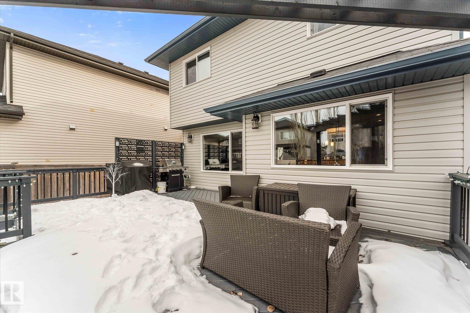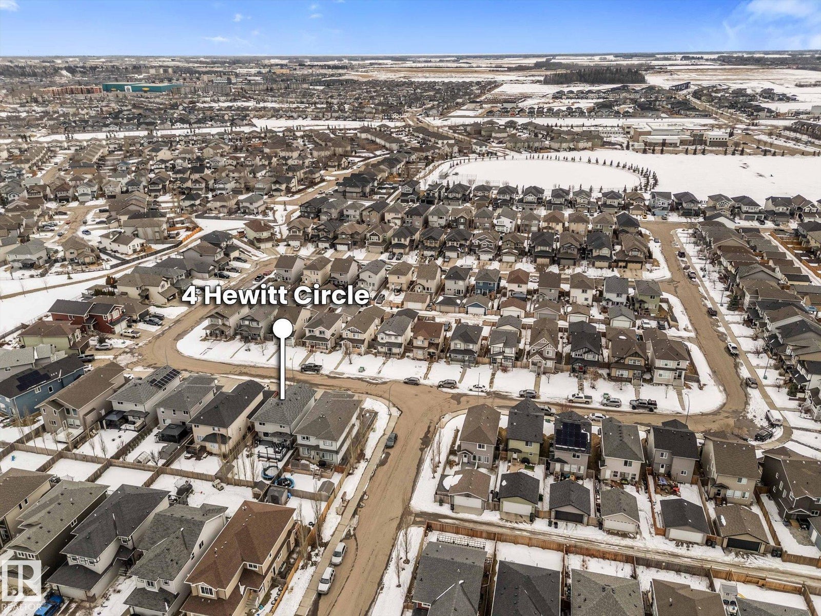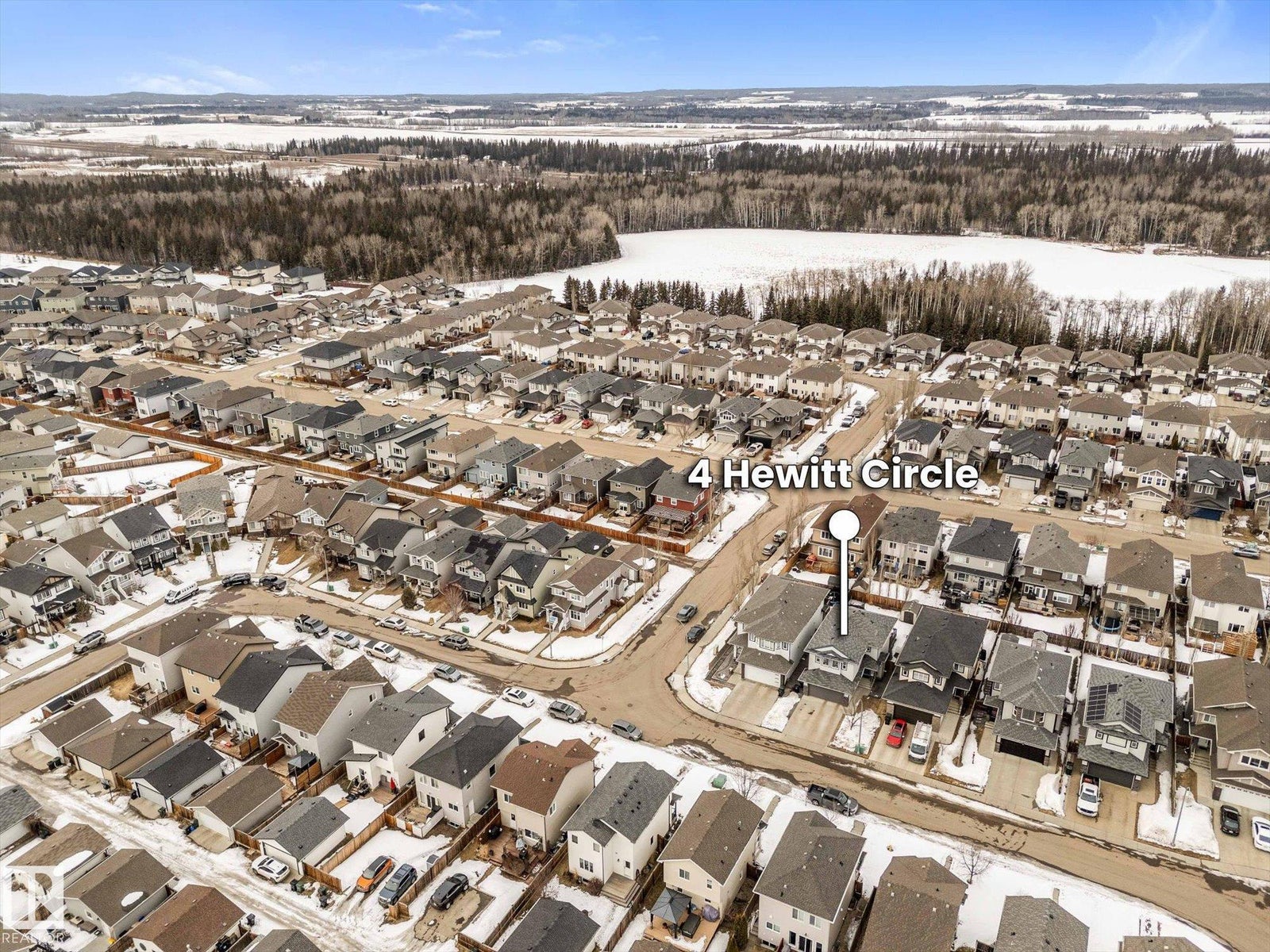 Welcome to 4 Hewitt Circle, located in the beautiful community of Harvest Ridge, on the west end of Spruce Grove. This well maintained 1819 sqft 2 storey is fully finished with 4 bedrooms, 3.5 bathrooms, a double attached garage and AC! On the main floor you will love the open concept floor plan with dark maple trim/doors and laminate flooring. The kitchen has dark cabinets, tile backsplash, SS appliance, a walk-through pantry, a large island & dining space large enough for a big table. The living room has large windows and an electric fireplace. Also on this level is a 2p bath and mudroom with access to the garage. Upstairs has a large bonus room, 3 bedrooms including the primary suite with walk-in closet and 4p ensuite. There is a main 4p bath and laundry on the upper floor as well. In the finished basement is the 4th bedroom, 3p bath with tiled shower, another family room with a wet bar. The north facing backyard is landscaped with a large deck and pergola.